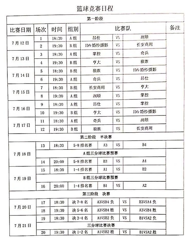 2017年7月12日,由市籃球協(xié)會組織舉辦的2017年“昂仕杯”籃球比賽在金牛山籃球場正式拉開帷幕。具體賽程如圖所示,歡迎廣大籃球愛好者屆時到現(xiàn)場觀賽助威。